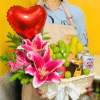 - Bunga Mawar Cantik: Hiasan bunga mawar segar berwarna-warni menambah sentuhan elegan dan kemewahan pada keranjang, menjadikannya hadiah yang tak terlupakan.