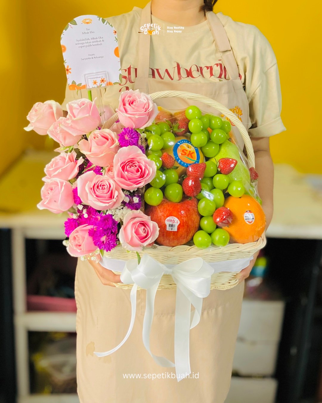 Ini bukan sekadar hampers biasa. Ini adalah sebuah pesan tulus yang dirancang untuk mencerahkan hari dan memberikan kekuatan bagi seseorang yang sedang dalam masa pemulihan. Keranjang ini diisi dengan buah-buahan pilihan terbaik seperti anggur Shine Muscat yang manis, apel premium, dan jeruk segar, lalu disempurnakan dengan rangkaian bunga mawar pink segar yang melambangkan kasih sayang dan harapan.