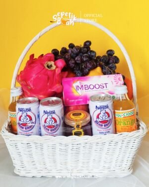 Paket Pemulihan 3-in-1: Kamu tidak perlu repot mencari isian terpisah. Dalam satu keranjang rotan cantik, sudah tersedia susu, vitamin, dan buah. Komplit!