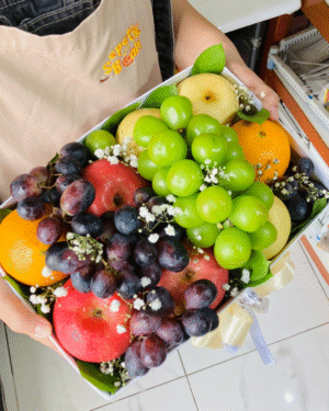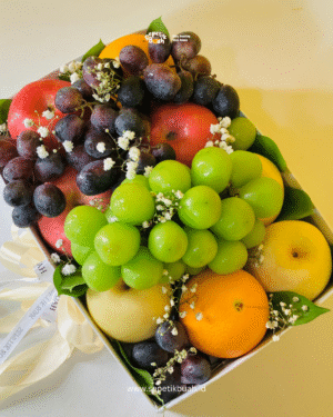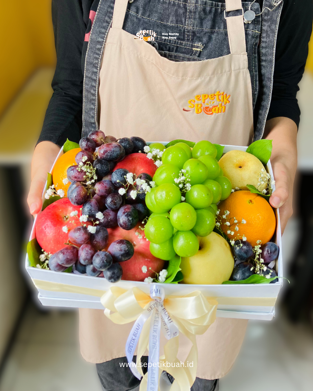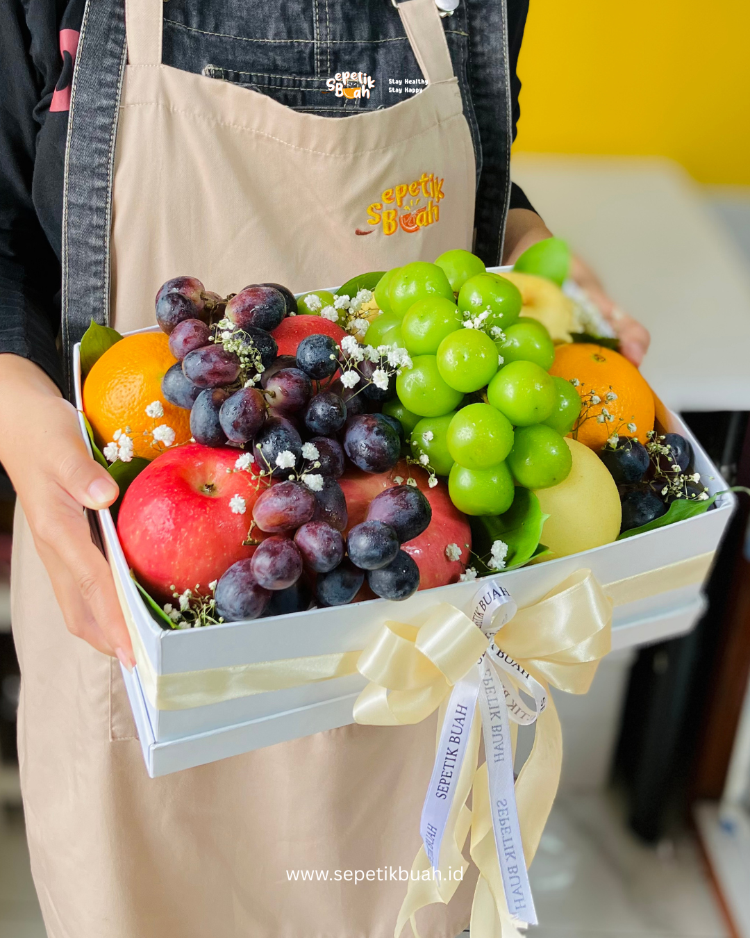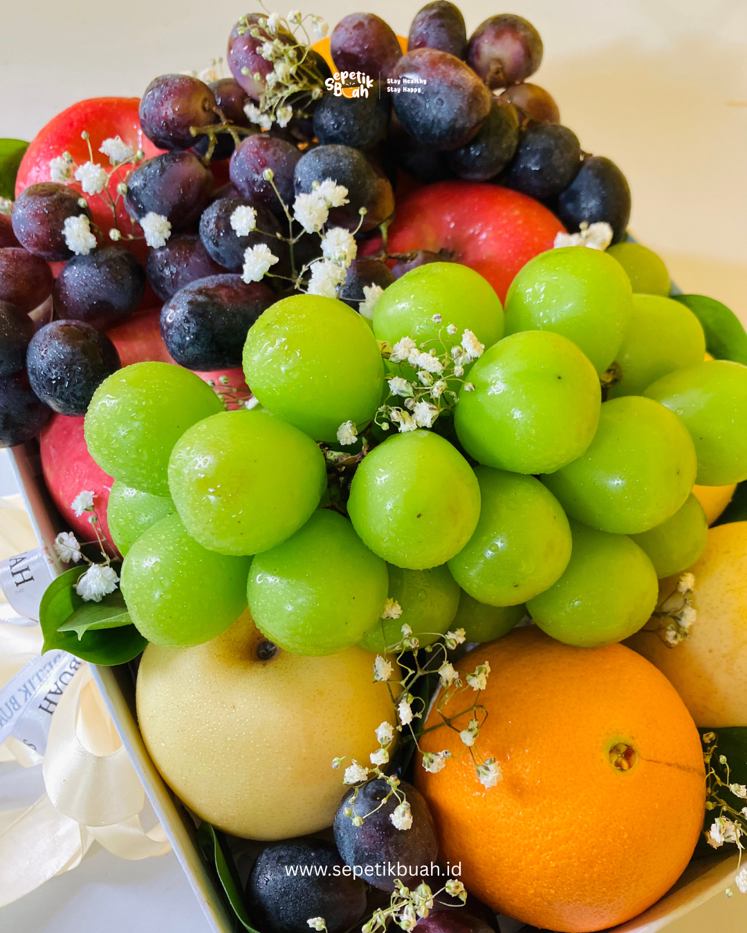 Lupakan keranjang biasa. Tampilan kotak yang bersih dan minimalis ini langsung memberikan kesan mewah dan personal. Setiap kotak kami isi hingga penuh dengan buah-buahan impor “Grade A” yang terbaik: Anggur Shine Muscat yang manis dan renyah, anggur hitam premium, Pir Asia yang juicy, apel merah segar, dan jeruk Sunkist. Sentuhan bunga baby’s breath menambah keanggunan bingkisan ini.