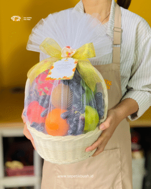 Presentasi Tulle yang Higienis: Seluruh rangkaian buah dibalut dengan kain tulle (jaring) berwarna putih bersih. Selain memberikan kesan mewah, balutan ini memastikan hantaran kamu tetap higienis dan terbebas dari debu selama proses pengiriman.