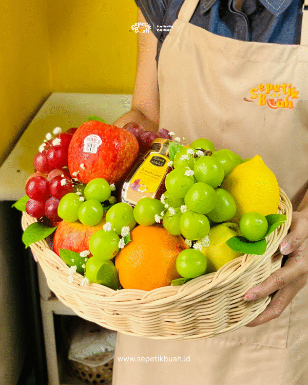 Keranjang rotan alami ini kami isi dengan buah-buahan pilihan terbaik yang kaya akan vitamin, seperti Apel Envy yang renyah, anggur merah dan hijau yang manis, jeruk kaya vitamin C, dan lemon segar. Sebagai pelengkap, kami sertakan satu stoples Madu Alami Al Shifa, madu impor berkualitas yang dikenal luas akan manfaatnya untuk kesehatan dan imunitas.