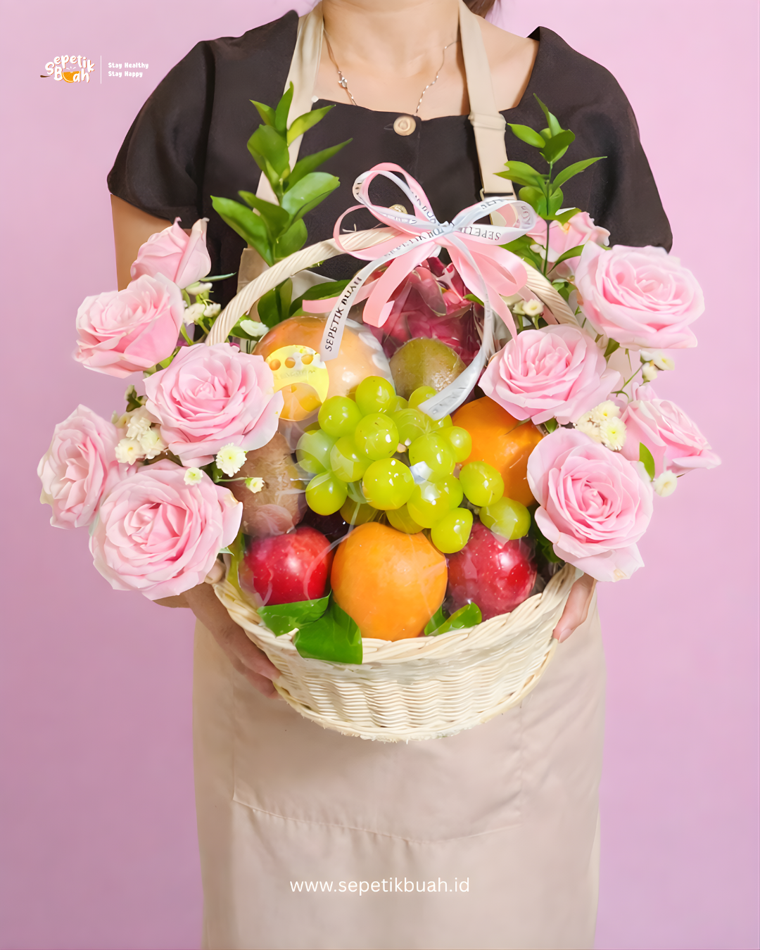 The Blushing Grace: Kemewahan Parcel Buah dalam Balutan Mawar Pink