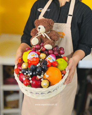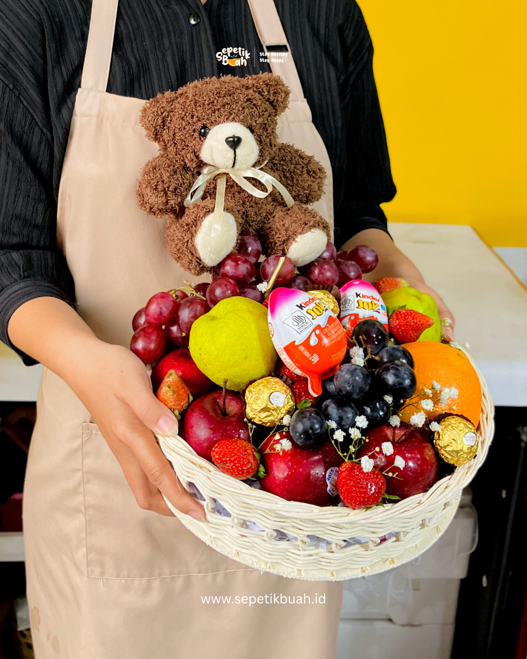 Tampilan Sangat Menggemaskan: Perpaduan warna-warni buah dengan boneka beruang membuat hampers ini sangat Instagrammable dan fotogenik.