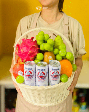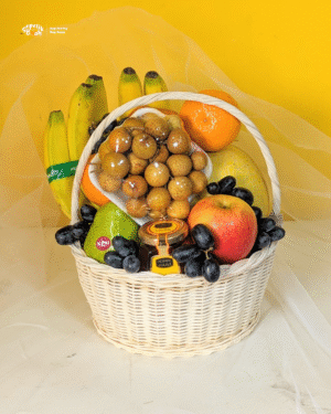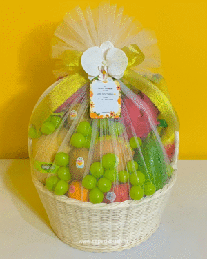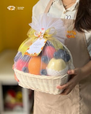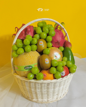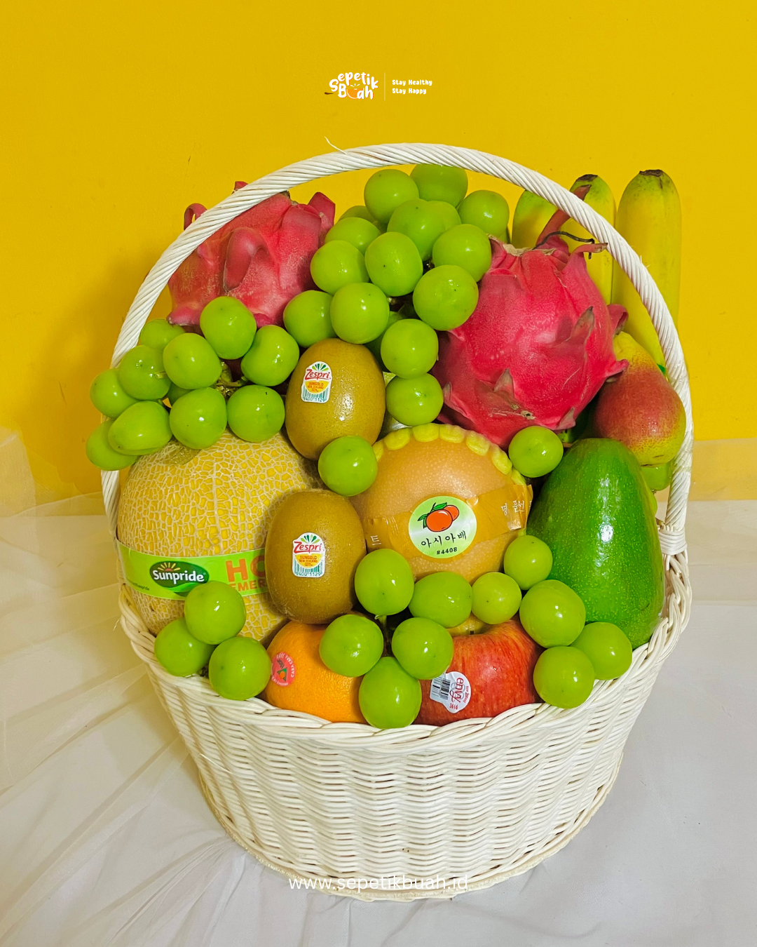 Keranjang rotan putih premium ini kami isi hingga penuh dengan buah-buahan impor terbaik. Lihat saja kemewahannya: gerombolan Anggur Shine Muscat yang manis, Buah Naga segar, Melon Sunpride utuh, Pir Korea (Asia Bae) yang juicy, Alpukat Mentega pilihan, Kiwi Zespri, apel, pisang, dan masih banyak lagi.