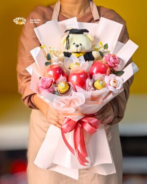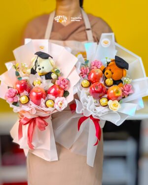 Sentuhan Bunga Segar: Kehadiran bunga mawar/carnation merah asli di sela-sela buah memberikan aroma harum dan tampilan yang jauh lebih mewah serta romantis.
