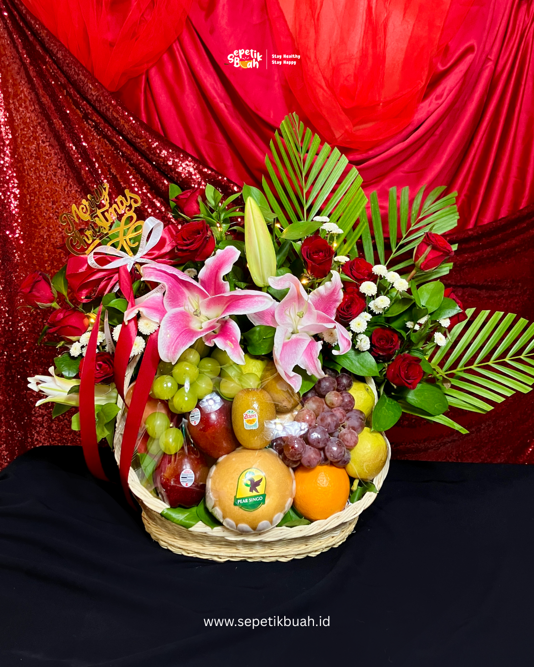 Tampil megah dengan topper emas “Merry Christmas”, hampers ini menggabungkan keindahan Bunga Lily Pink yang mekar sempurna dan Mawar Merah segar yang melambangkan kasih sayang Natal.