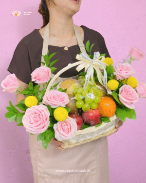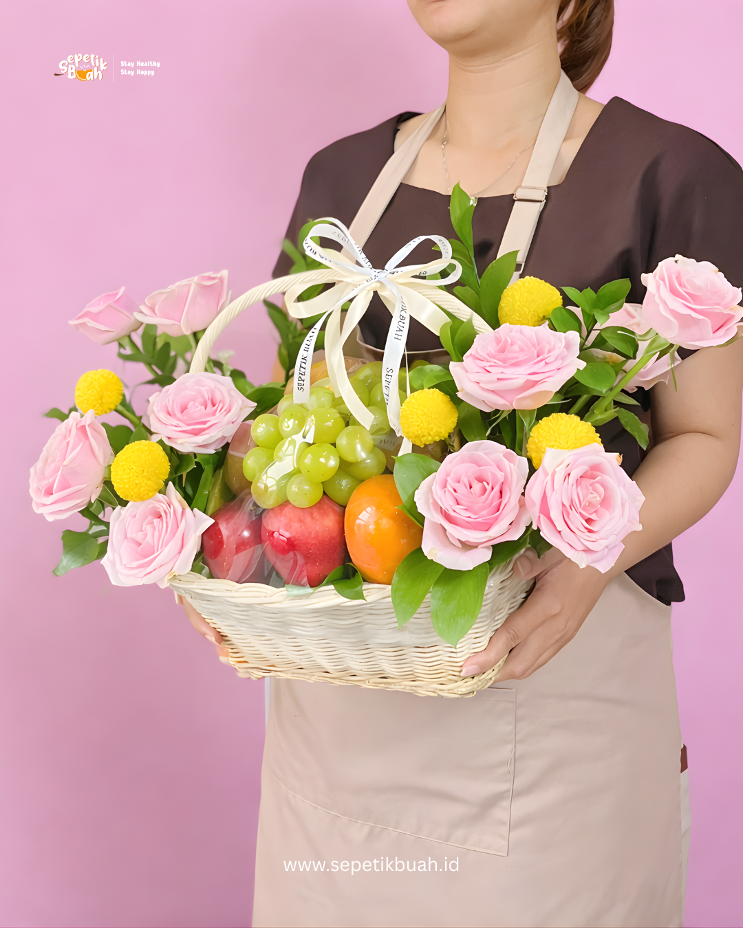 Kesegaran Buah Pilihan: Di balik cantiknya bunga, tersimpan Anggur Shine Muscat yang segar, Apel Merah yang renyah, Jeruk manis, dan Pir pilihan. Paket komplit untuk memanjakan lidah dan tubuh.